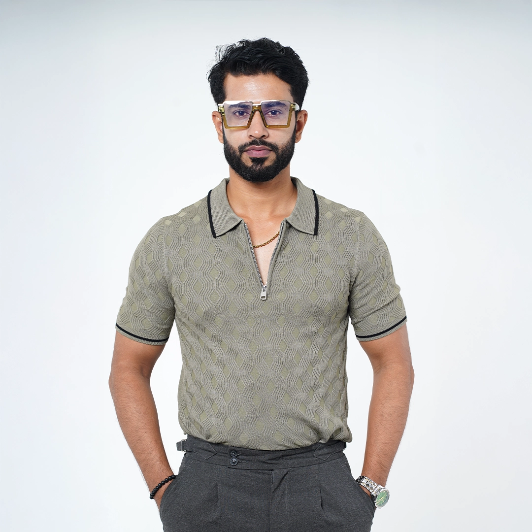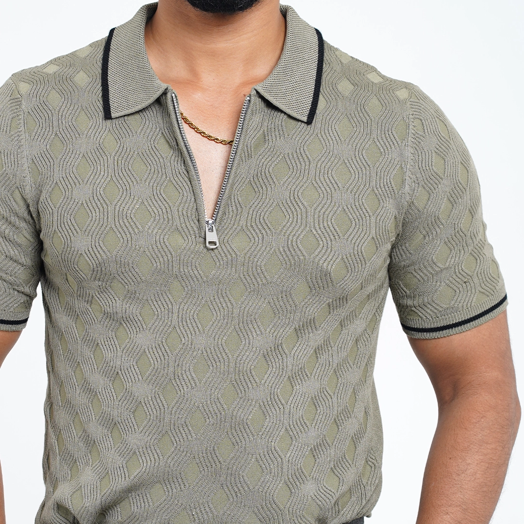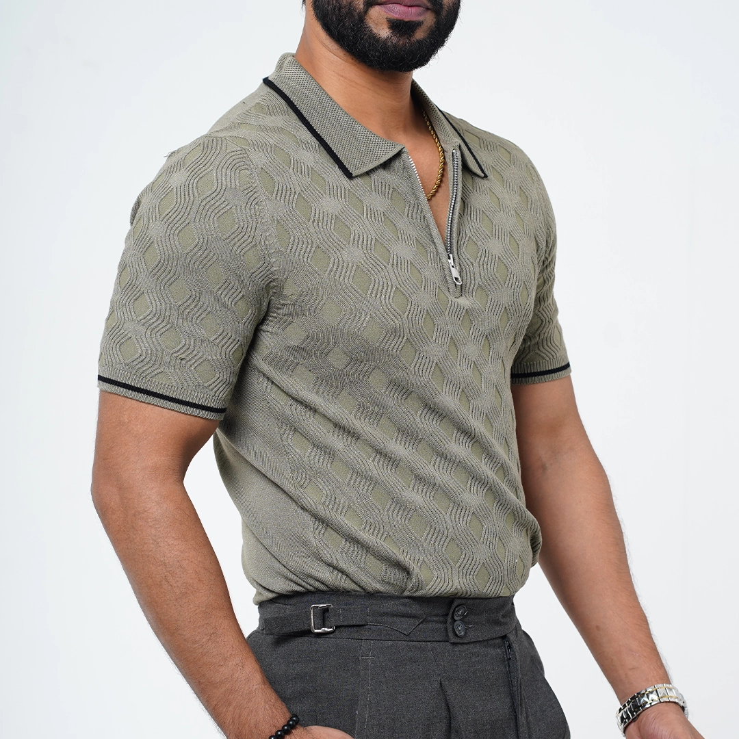Textured Zip-Neck Old Money Polo Shirt – Sand Beige with Black Trim Original price was: 1,550৳ .Current price is: 999৳ .